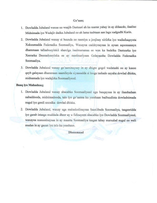 Golaha Wasiirrada Jubbaland waxay go'aamadaas ku sifeeyeen afgambi ka dhan ah nidaamka dastuuriga ah, iyagoo ku adkeystay in ay yihiin kuwo halis gelinaya dowladnimada Soomaaliya.
