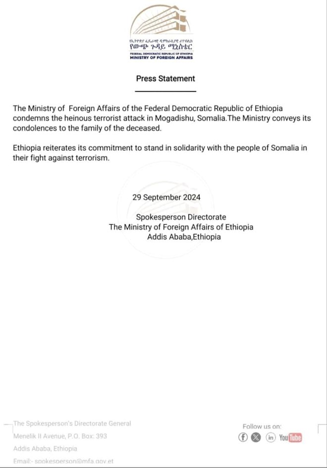 Axad, September, 29, 2024 (HOL) - Wasaaradda arrimaha dibadda dowladda federaalka Itoobiya ayaa cambaareysay qaraxii shalay ka dhacay magaalada Muqdisho ee caasimadda Soomaaliya oo ay ku geeriyoodeen ugu yaraan shan qof oo rayid u badan.