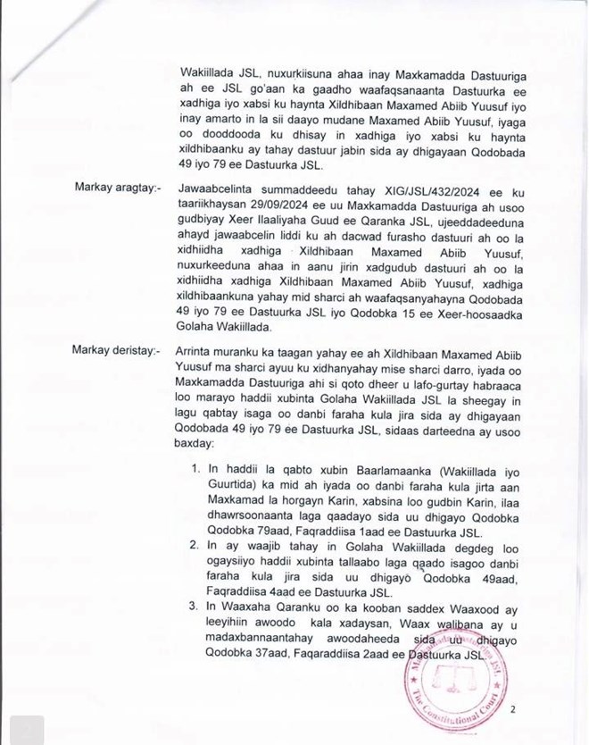 "Waxa la farayaa dhammaan hay’adaha kala duwan ee qaranka JSL in ay dastuurka dalka u hogaansamaan oo ixtiraamaan" ayay maxkamadu ku tidhi qaraarka.