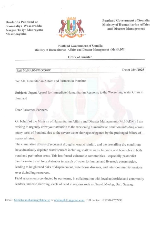 Khamiis, April 10, 2025 (HOL) - Wasaaradda Gargaarka iyo Maareynta Musiibooyinka Puntland (MoHADM) ayaa soo saartay codsi degdeg ah oo gurmad bini’aadantinimo ah kaddib xaalad adag oo biyo la’aan ah oo ka jirta qaybo badan oo ka mid ah Puntland, taas oo sababtay barakac, dhimasho xoolo, iyo kororka cudurrada la xiriira biyo la’aanta.