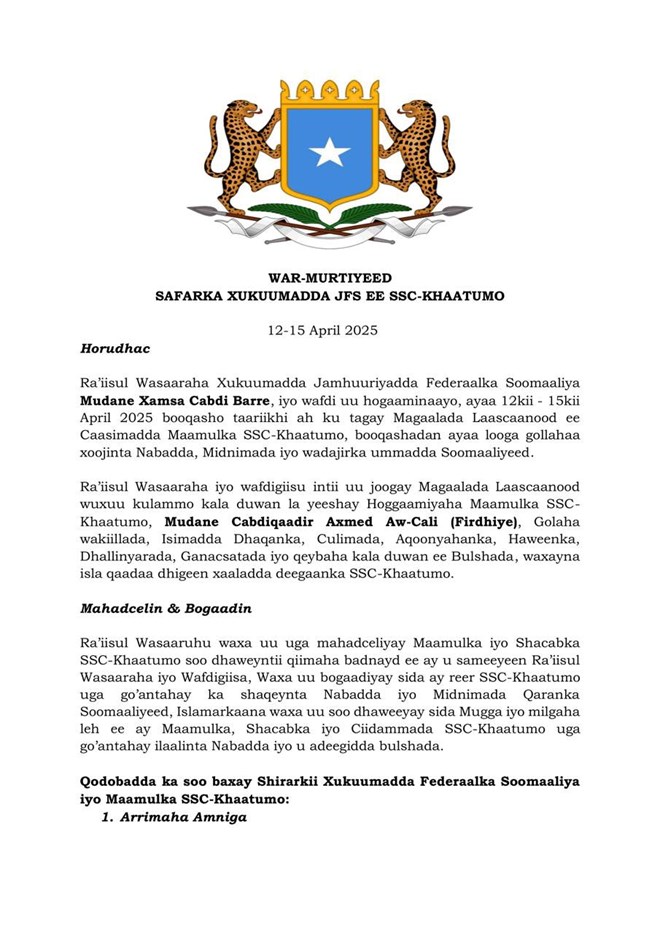 Talaado, April 15, 2025 (HOL) - Ra’iisul Wasaaraha Xukuumadda Federaalka Soomaaliya, Xamse Cabdi Barre, ayaa la wareegay 25 maxbuus oo kasoo jeeda Somaliland, kuwaas oo lagu qabtay dagaalladii ka dhacay gobolka Sool, sida lagu sheegay warmurtiyeed kasoo baxay safarkiisii uu ku tegay deegaanka SSC-Khaatumo.