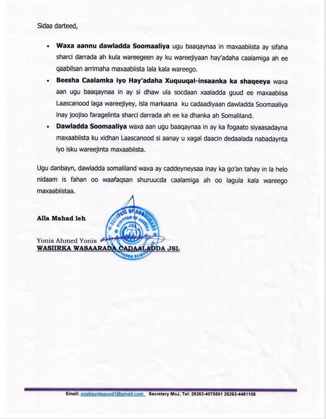 Warsaxaafadeed kasoo baxay Wasaaradda Caddaaladda Somaliland ayaa walaac xooggan lagaga muujiyay xaaladda sii deynta maxaabiistan, iyadoo lagu sheegay in la afduubay, isla markaana lagu qasbay inay xidhaan calanka Soomaaliya, taas oo aanay oggolayn.