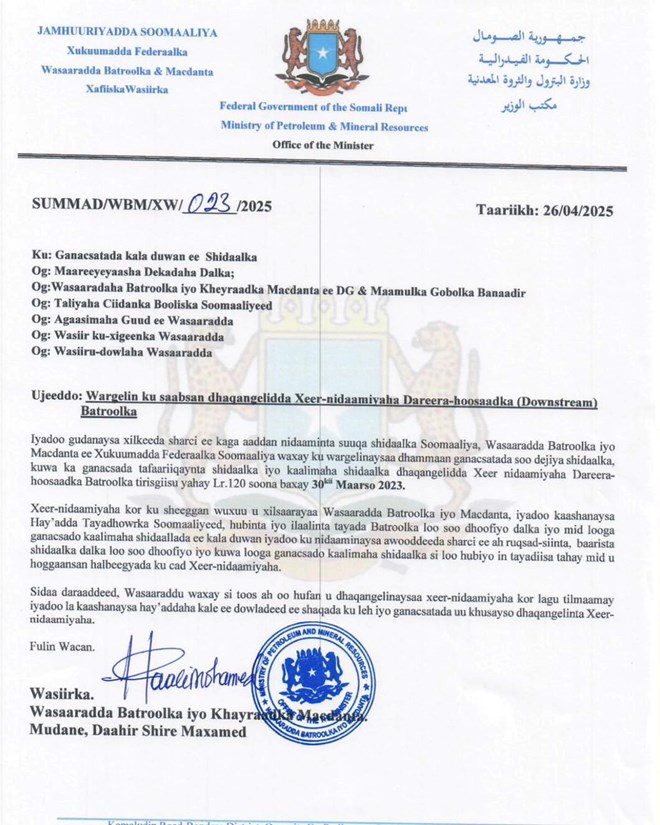 Axad, April 27, 2025 (HOL) - Wasaaradda Batroolka iyo Macdanta ee Xukuumadda Soomaaliya ayaa ku wargelisay dhammaan ganacsatada Soomaaliyeed ee soo dejiya shidaalka, kuwa ka ganacsada tafaariiqaynta shidaalka iyo kaalimaha shidaalka dhaqangelidda Xeer nidaamiyaha Dareera-hoosaadka Batroolka tirisgiisu yahay Lr.120 soona baxay 30 Maarso 2023.