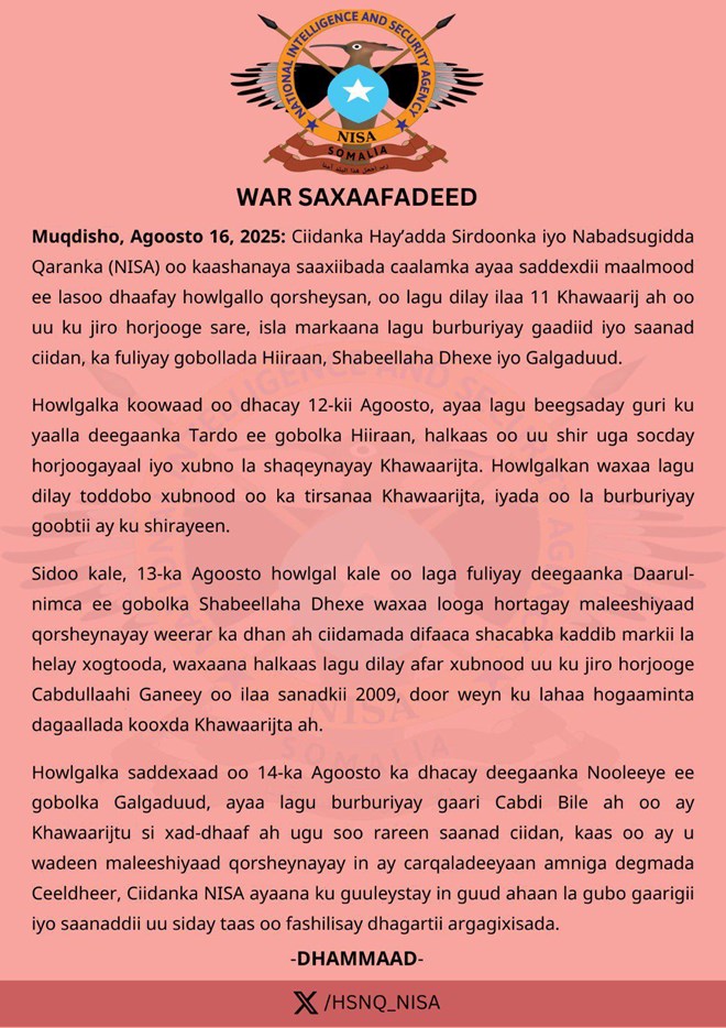 Sabti, Agoosto 16, 2025 (HOL) - Ciidanka Hay’adda Sirdoonka iyo Nabadsugidda Qaranka (NISA), oo kaashanaya saaxiibada caalamka, ayaa saddexdii maalmood ee lasoo dhaafay fuliyay howlgallo qorsheysan oo ka dhacay gobollada Hiiraan, Shabeellada Dhexe iyo Galgaduud, kuwaas oo lagu dilay ilaa 11 xubnood oo ka tirsanaa kooxda Al shabaab, waxaana lagu burburiyay gaadiid iyo saanad ciidan.