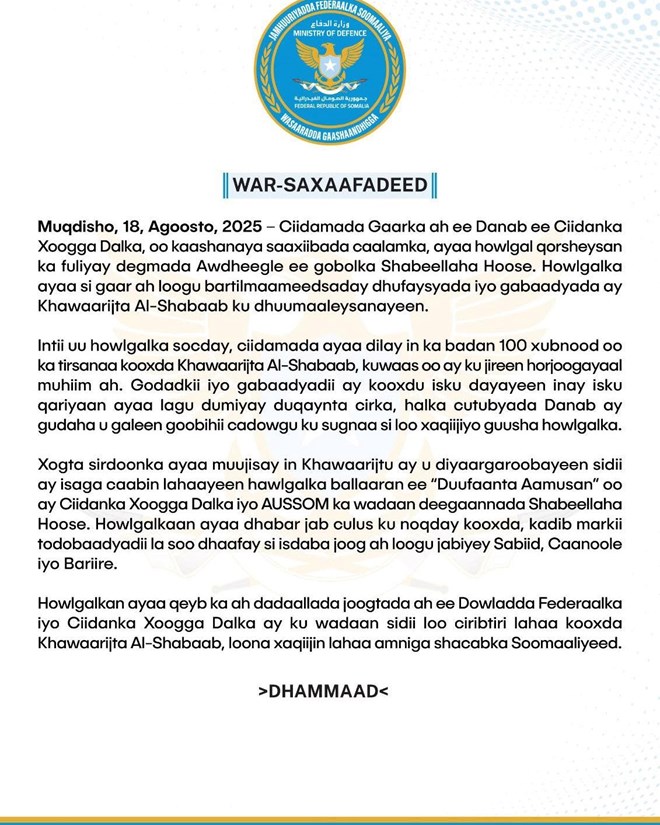 newsinside"Intii uu howlgalka socday, ciidamada ayaa dilay in ka badan 100 xubnood oo ka tirsanaa kooxda Khawaarijta, kuwaas oo ay ku jireen horjoogayaal muhiim ah. Godadkii iyo gabaadyadii ay kooxdu isku dayayeen inay isku qariyaan ayaa lagu dumiyay duqaynta cirka, halka cutubyada Danab ay gudaha u galeen goobihii cadowgu ku sugnaa si loo xaqiijiyo guusha howlgalka" ayaa lagu yiri Warsaxafadeedka kasoo baxay Wasaaradda Gaashaandhigga.