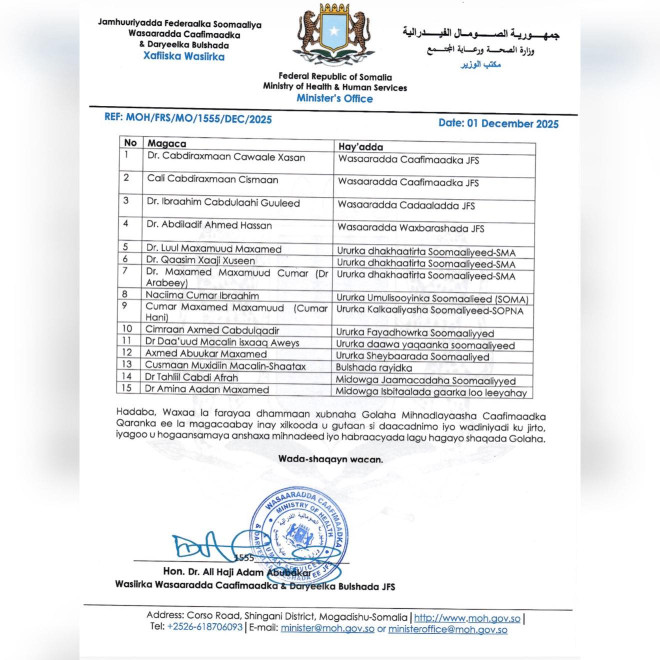 Talaado, December 2, 2025 (HOL) - Wasiirka Wasaaradda Caafimaadka iyo Daryeelka Bulshada Soomaaliya, Dr. Ali Haji Adam, ayaa Magacaabay xubnaha cusub ee Guddiga Golaha Mihnadlayaasha Caafimaadka Qaranka (G-MCQ), kaddib markii uu soo gebogabeeyay habraacyadii sharciyeed iyo tixgelinnadii lagama maarmaanka u ahaa dhismaha guddigan muhiimka ah sida ay sheegtay Wasaaradda Caafimaadka.