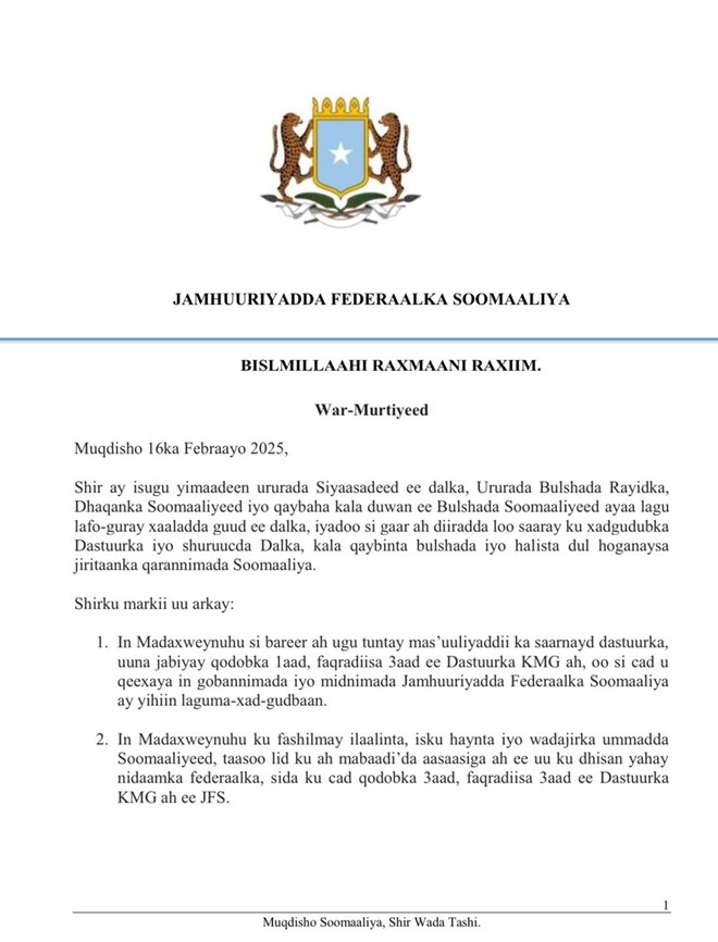 Axad, February 16, 2025 (HOL) - War saxaafadeed ayaa laga soo saaray Shirkaan labadii maalmood ee lasoo dhaafay ka socday Xarunta Xisbiga Himilo Qaran ee uu hogaamiyo Madaxweynihii hore ee Soomaaliya Sheekh Shariif Sheekh Axmed, Shirkaan waxaa ka qeyb galay ururada Siyaasadeed ee dalka, Ururada Bulshada Rayidka, Dhaqanka Soomaaliyeed iyo qaybaha kala duwan ee Bulshada Soomaaliyeed waxaana diirada la saaray xaaladda guud ee dalka, iyadoo si gaar ah diiradda loo saaray ku Dastuurka iyo shuruucda Dalka.