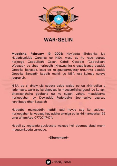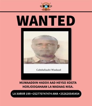 Khamiis, February 20, 2025 (HOL) - Taliska hay'adda Nabadsugida iyo Sirdoonka Qaranka Soomaaliyeed ee NISA ayaa baahiyay sawirka iyo macluumaadka Horjooge lagu magacaabo Cabdullaahi Xasan Cabdi Cosoble oo loo yaqaano Wadaad, kaasoo kooxda Al-shabaab u qaabilsan waxay ugu yeeraan zakawaatka gobolka Banaadir.