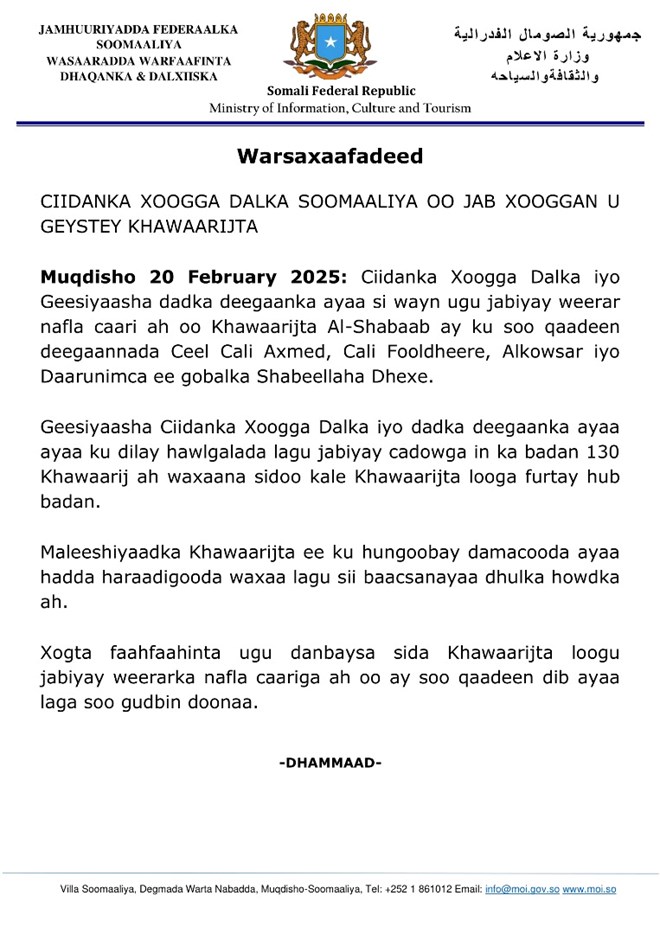 Khamiis, February 20, 2025 (HOL) - Dowladda Fedaraalka Soomaaliya ayaa sheegtay in ciidamada xoogga dalka oo kaashanaya kuwa deegaanka ay ku guuleysteen in ay iska caabiyaan weerar ay ururka Al-Shabaab ku soo qaadeen degaano ka tirsan gobolka Shabeellaha Dhexe.