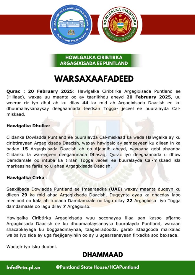 Khamiis, February 20, 2025 (HOL) - Ciidanka La-dagaalanka Argagixisada Puntland ayaa la wareegay deegaannada Dhaqas, Qurac, iyo Damdamle, kuwaas oo ka tirsan Buuraha Calmiskaad ee gobolka Bari, halkaas oo muddo 7 sano ah farriisin u ahayd Daacish.