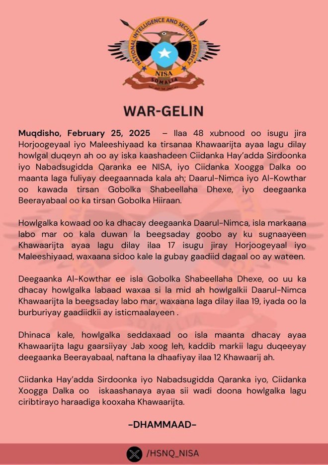 Talaado, February 25, 2025 (HOL) - Taliska hay'adda Nabadsugida iyo Sirdoonka Qaranka Soomaaliyeed ee NISA ayaa faahfaahin dheeraad ah ka bixiyay duqeymo dhanka cirka ah oo ay iska kaashadeen ciidanka xoogga dalka oo maanta laga fuliyay gobolada Shabeellaha Dhexe iyo Hiiraan.