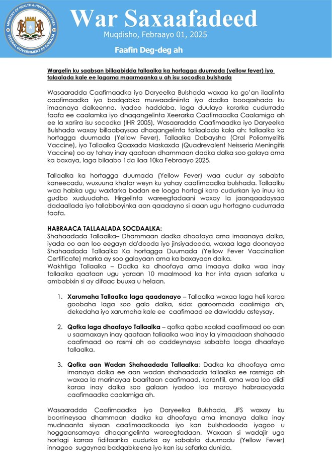Isniin, February 3, 2025 (HOL) - Wasaaradda Caafimaadka Soomaaliya ayaa soo saartay amaro aan laga weecan karin oo taabanaya dadka imaanaya iyo kuwa ka safraya Soomaaliya, tallaabaani ayaa ah in ay qasab ku tahay in ay qaataan tallaallada ay ka midka yihiin kan looga hortago duumada, tallaalka dabaysha iyo tallaalka qaaxada maskaxda.