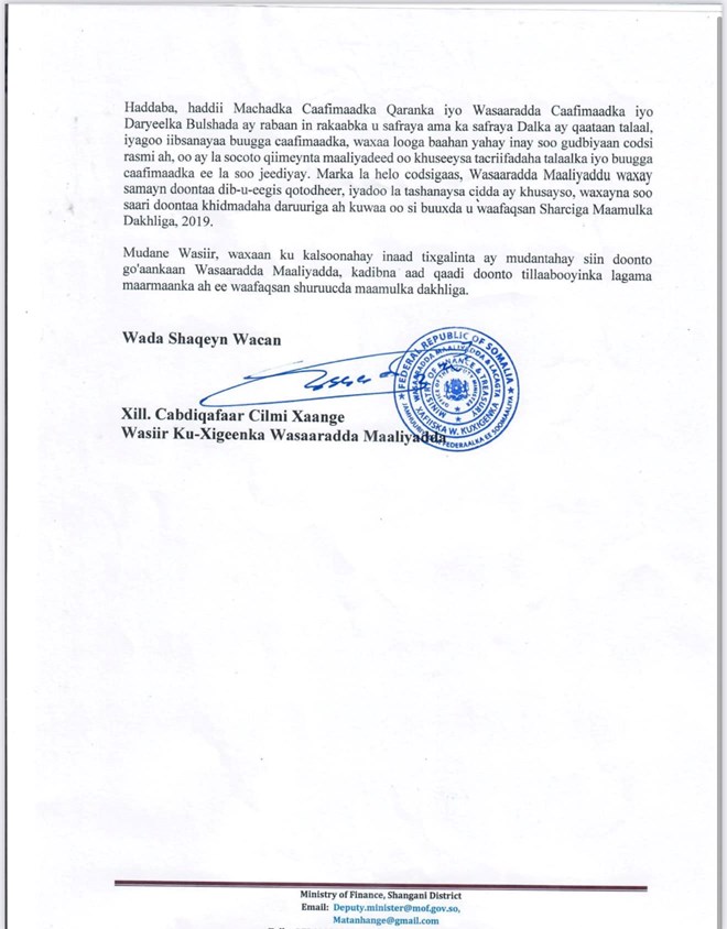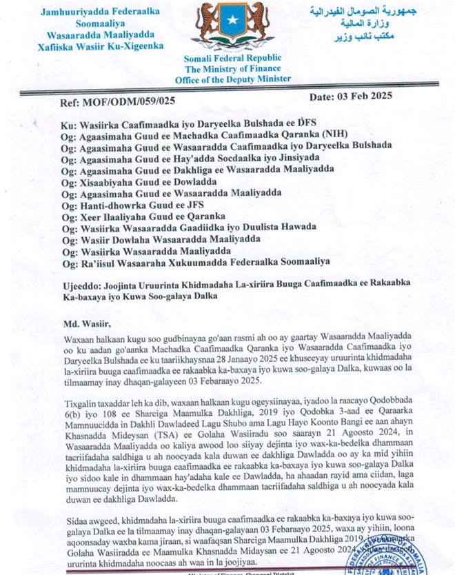 Isniin, February 3, 2025 (HOL) - Wasaaradda Maaliyadda xukuumadda Soomaaliya ayaa joojiyey khidmadaha la xiriira buugga caafimaadka ee rakaabka ka baxaya iyo kuwa soo galaya dalka, kuwaas oo ay maanta soo rogtay wasaaradda caafimaadka Soomaaliya.