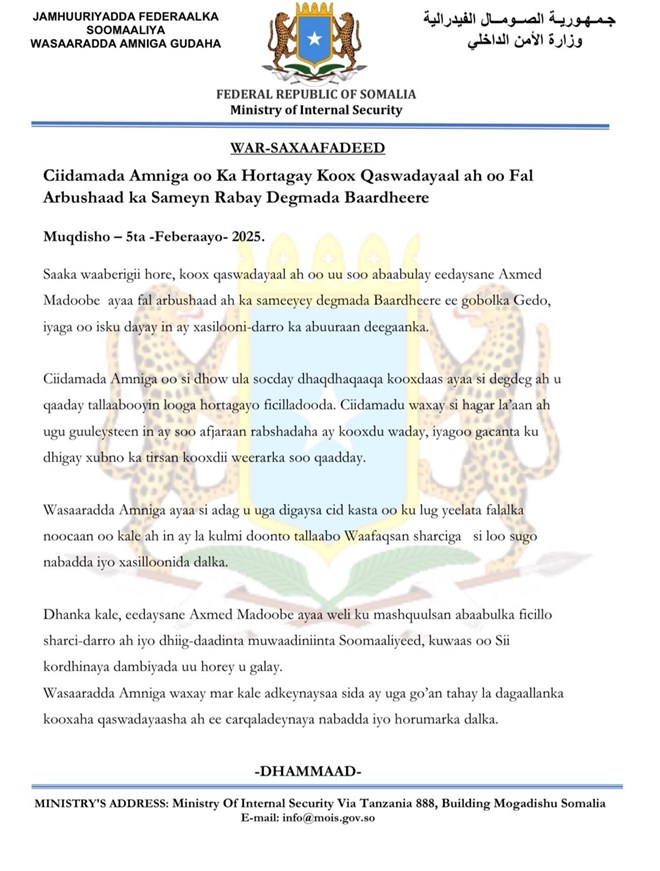 Arbaco, February 5, 2025 (HOL) - Warsaxafadeed kasoo baxay Wasaaradda amniga gudaha Xukuumadda Fedaraalka Soomaaliya ayaa faahfaahin dheeraad ah looga bixiyay dagaal khasaare kala duwan geystay oo maanta ku dhexmaray degmada Baardheere ee gobolka Gedo ciidamada dowladda Fedaraalka iyo kuwa maamulka Jubbaland.