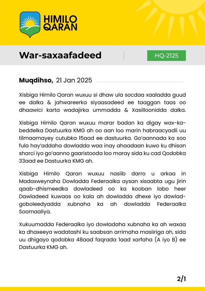 Talaado, January 21, 2025 (HOL) - War qoraal ah usoo saaray Xisbiga Himilo Qaran ayuu ku sheegay in uu si dhaw ula socdo xaaladda guud ee dalka & jahwareerka siyaasadeed ee taaggan taas oo xisbigu tilmaamay inuu dhaawici karo wadajirka ummadda & Xasilloonidda dalka.
