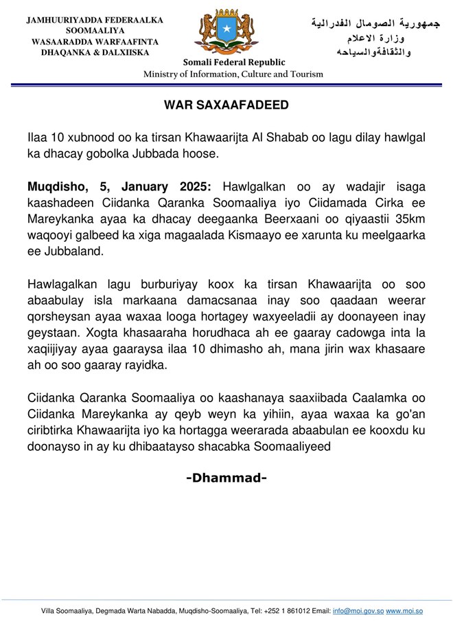 Axad, January 5, 2025 (HOL) - Ciidamada dowladda Fedaraalka Soomaaliya oo kaashanaya kuwa dowladda Mareykanka ee dhanka cirka ah ka taageera ayaa howlgal khasaare xoogan lagu gaarsiiyay kooxda Al-shabaab ka fuliyay deegaanka Beerxaani ee gobolka Jubbada Hoose.