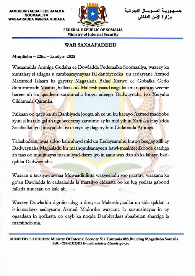 newsinside"Wasaaradda Amniga Gudaha ee Dowladda Federaalka Soomaaliya, waxay ka xuntahay, si adagna u cambaaraynaysaa fal dambiyeedka uu eedaysane Axmed Maxamed Islaam ka gaystay magaalada Beledxaawo ee gobolka Gedo duhurnimadii maanta, halkaas oo maleeshiyaad isaga ka amar qaata ay weerar bareer ah ku qaadeen xarumaha loogu adeego dadweynaha iyo xeryaha ciidamada qaranka" ayaa lagu yiri Warsaxafadeedka kasoo baxay Wasaaradda amniga gudaha.