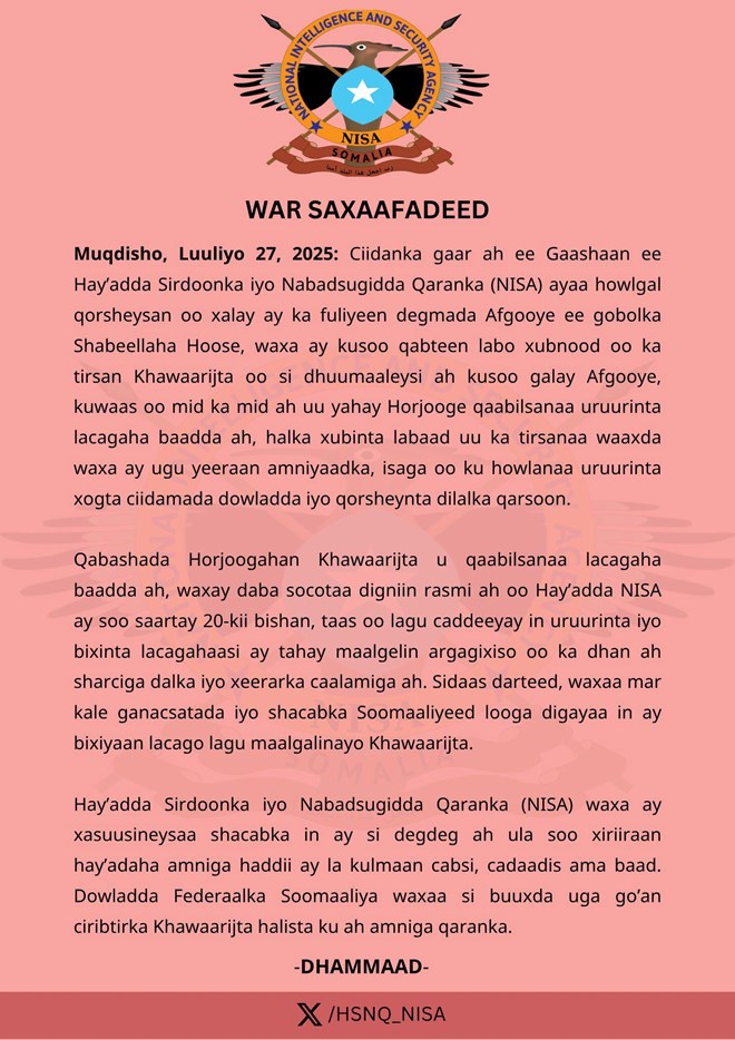 newsinsideQabashada horjoogahan ayaa si toos ah ugu xirnaanaysa digniin rasmi ah oo Hay’adda NISA ay soo saartay 20-kii Luuliyo 2025, taas oo lagu caddeeyay in uruurinta iyo bixinta lacagaha baadda ah ay la macno tahay maalgelin argagixiso, kuna xadgudbeysa sharciga dalka iyo xeerarka caalamiga ah ee la dagaalanka maalgelinta argagixisada sida lagu sheegay bayaanka kasoo baxay NISA.