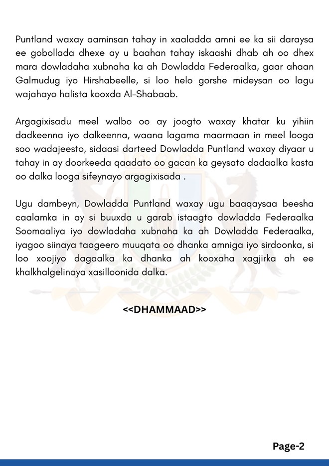 Puntland waxay ugu dambayn ugu baaqday beesha caalamka inay taageero muuqata siiso dowladda Federaalka iyo dowladaha xubnaha ka ah, si loo xoojiyo dagaalka ka dhanka ah kooxaha xagjirka ah ee khalkhalgelinaya xasilloonida Soomaaliya.