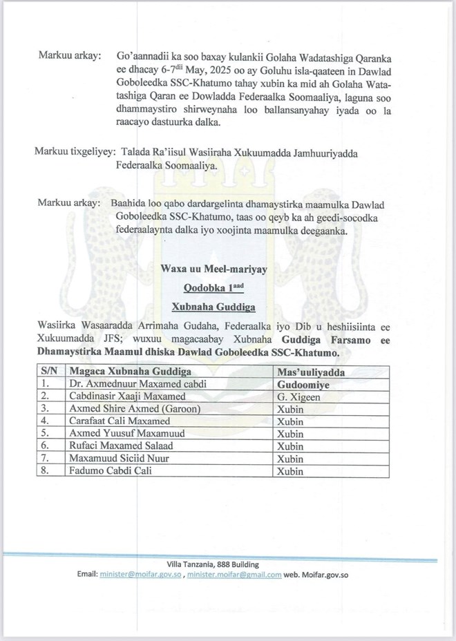Sabti, Luulyo 5, 2025 (HOL) - Wasiirka Wasaaradda Arrimaha Gudaha iyo Dib u Heshiisiinta Xukuumadda Federaalka Soomaaliya Cali Yuusuf Cali Xoosh ayaa maanta wareegto uu soo saaray si rasmi ah ugu magacaabay guddiga farsamo ee dhameystirka maamul goboleedka SSC Khaatumo.