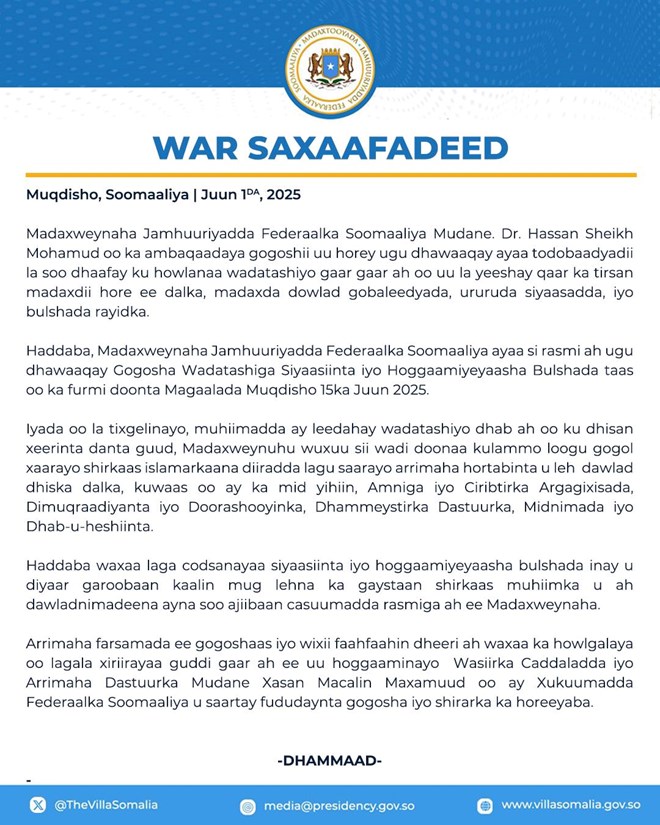 Axad, Juun 1, 2025 (HOL) - Madaxweynaha Soomaaliya, Xasan Sheekh Maxamuud, ayaa si rasmi ah ugu dhawaaqay Shir Wadatashi Qaran oo lagu qabanayo Muqdisho 15-ka Juun 2025.