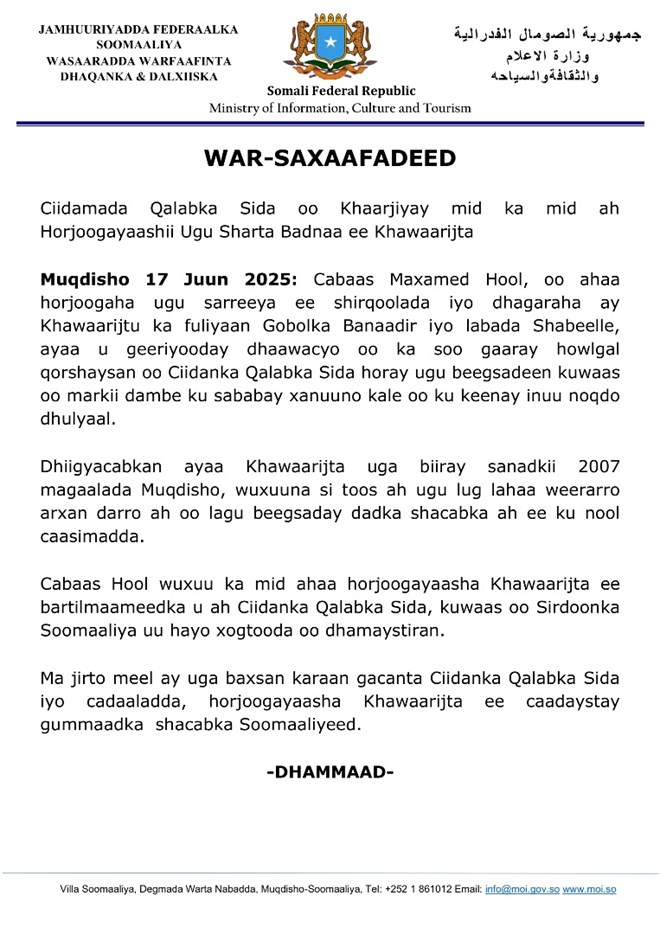 Talaado, Juun 17, 2025 (HOL) - Wasaaradda Warfaafinta Soomaaliya ayaa xaqiijiyay geerida Cabaas Maxamed Hool oo ka mid ahaa saraakiisha sar sare ee Al-Shabaab, waxaana lagu eedeeyay in uu ka dambeeyay weeraro lagu hoobtay oo ka dhacay Muqdisho iyo Shabeellooyinka.