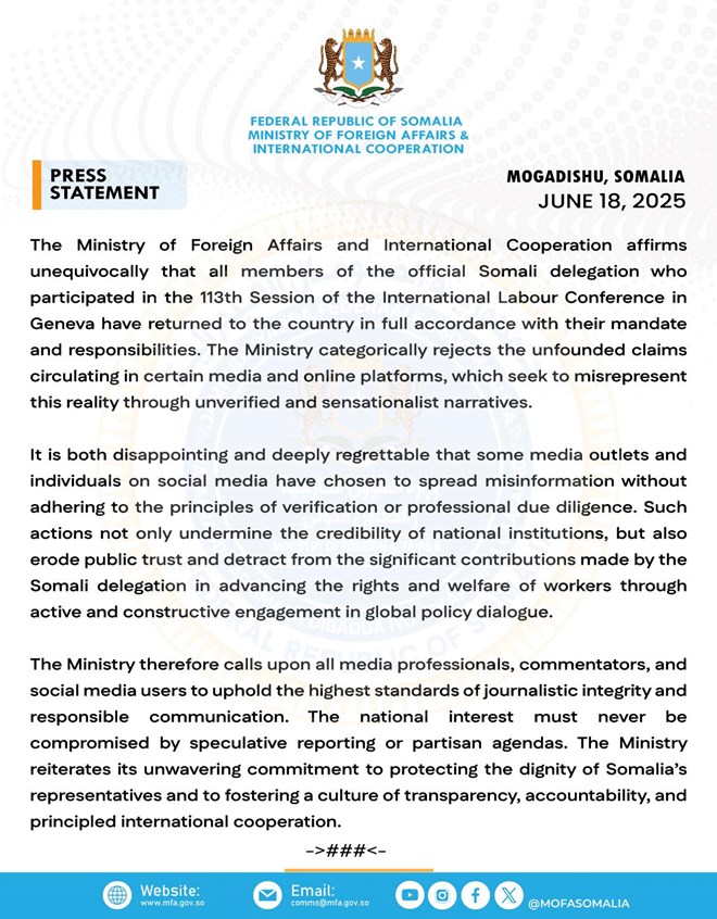 Khamiis, Juun 19, 2025 (HOL) - Wasaaradda Arrimaha Dibadda iyo Iskaashiga Caalamiga ah ayaa si adag u beenisay warar lagu faafiyay qaar ka mid ah warbaahinta iyo baraha bulshada oo sheegayay in xubno ka mid ah ergadii Soomaaliya ee ka qeyb gashay Shirkii 113aad ee Shaqada Adduunka ee ka dhacay magaalada Geneva ay dalka dib ugu soo noqon waayeen.