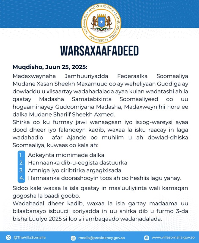 Arbaco, Juun 25, 2025 (HOL) - Shir u dhaxeeya Madaxweynaha Soomaaliya Xasan Sheekh Maxamuud iyo Madasha Samatabixinta Soomaaliyeed ayaa maanta ka furmay magaalada Muqdisho sida ay sheegtay madaxtooyada Soomaaliya.