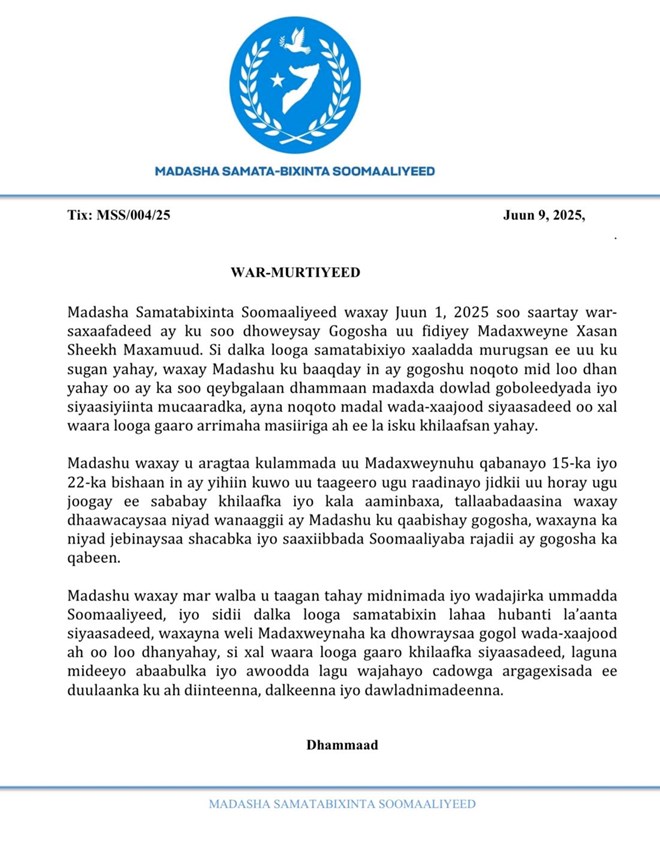 Isniin, Juun 9, 2025 (HOL) - Madasha Samatabixinta Soomaaliyeed ayaa maanta war ay soo saareen ku sheegay in Madaxweynaha Soomaaliya Xasan Sheekh Maxamuud uu wali ku taagan yahay jidkii sababay khilaafka Siyaasadeed ee Soomaaliya.