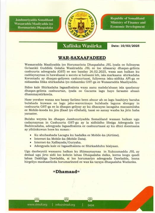 newsinside"Waxaa soo baxay fariimo been abuur ah oo lagu baahiyey baraha bulshada, kuwaas oo lagu jahawareerinayo bulshada laguna sheegay in cashuurta GST ee la dhaqan-geliyey ay ku dhacayso lacagaha la isugu diro taleefanka gacanta ee Zaad iyo eDahab, taas oo aan waxba ka jirin haba yaraatee," ayaa lagu yidhi qoraal kasoo baxay Wasaaradda Maaliyadda.