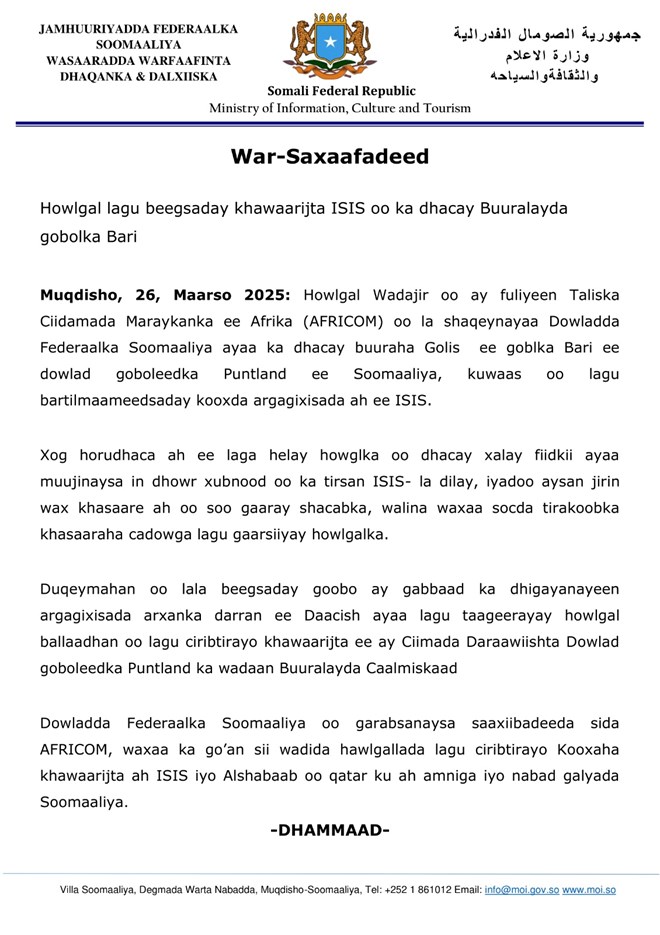 Arbaco, Maarso 26, 2025 (HOL) - Warsaxafadeed kasoo baxay Wasaaradda Warfaafinta Xukuumadda Fedaraalka Soomaaliya ayaa faahfaahin dheeraad ah looga bixiyay howlgal wadajir oo lagu beegsaday kooxda Daacish ee ku sugan buuraha Golis ee gobolka Bari.