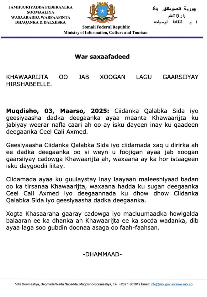 Isniin, Maarso 3, 2025 (HOL) - Dowladda Fedaraalka Soomaaliya ayaa shaaca ka qaaday in ciidanka xoogga dalka iyo kuwa dadka deegaanka ay wali gacanta ku hayaan deegaanka Ceel Cali Axmed ee gobolka Shabeellaha Dhexe.