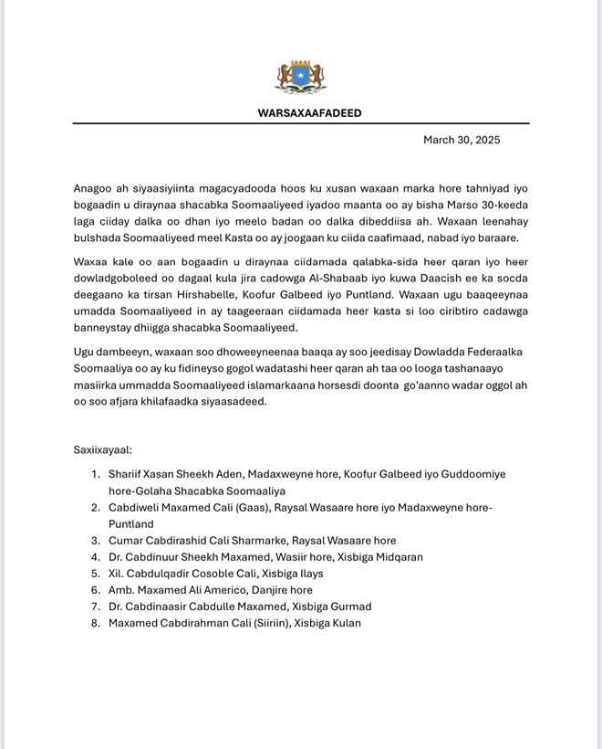 Isniin, Maarso 31, 2025 (HOL) - Siyaasiyiin hor leh ayaa kusoo biiray dadka sida weyn usoo dhoweenaya gogoshii wadatashiga nabadeed ee uu ku baaqay Madaxweynaha Soomaaliya Xasan Sheekh Maxamuud iyagoona ku tilmaamay mid loo baahnaa si dalka daruufaha adag uu marayo looga saaro.