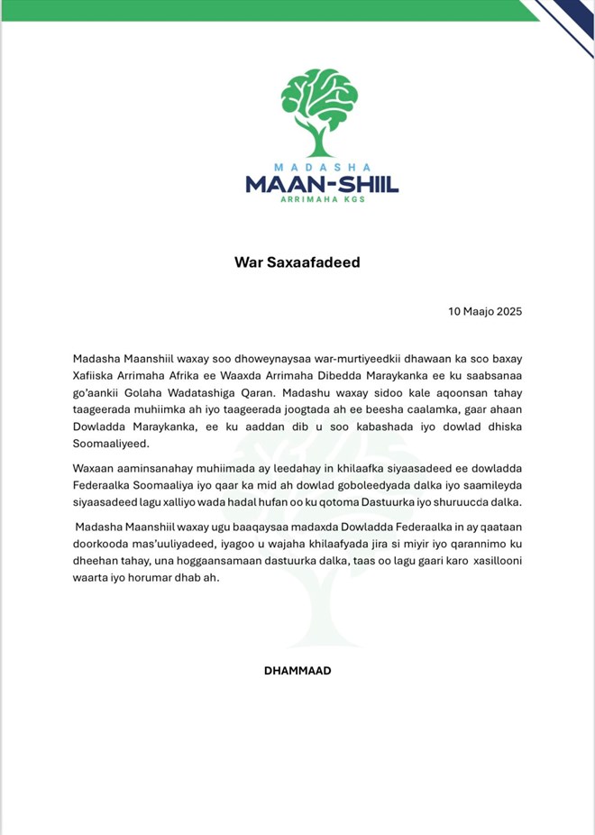 Ugu dambeyn, Madasha Maanshiil waxay ugu baaqday madaxda Dowladda Federaalka in ay qaataan doorkooda mas'uuliyadeed, iyagoo u wajaha khilaafyada jira si miyir iyo qarannimo ku dheehan tahay, una hoggaansamaan dastuurka dalka, taas oo lagu gaari karo xasillooni waarta iyo horumar dhab ah.
