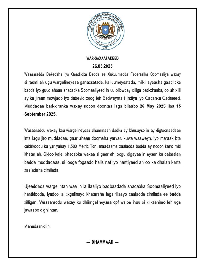 War ay soo saartay wasaaradda waxa ay tilmaamtay in Muddada uu bad-xiranka socon doono ay tahay laga bilaabo 26 May 2025 ilaa 15 Sebtember 2025, waxaana ay ka digtay inaan xiilliyadaan inta lagu gudajiro aan loo dhowaan karin badda maadama mowjadaha culus ay sababi karaan khasaare hanti iyo mid nafeed.