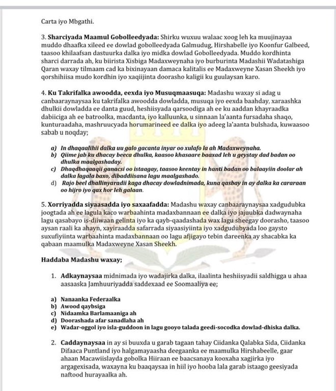Sabti, May 31, 2025 (HOL) - Madasha Samata-bixinta Mucaaradka oo uu guddoomiye u yahay madaxweynihii hore ee Soomaaliya, Shariif Sheikh Axmed ayaa war murtiyeed ay soo saareen waxay ku eedeeyeen Madaxweynaha Soomaaliya, Xasan Sheekh Maxamuud, inuu wiiqayo heshiisyadii siyaasadeed ee saldhigga u ahaa dhismaha Jamhuuriyadda Saddexaad.