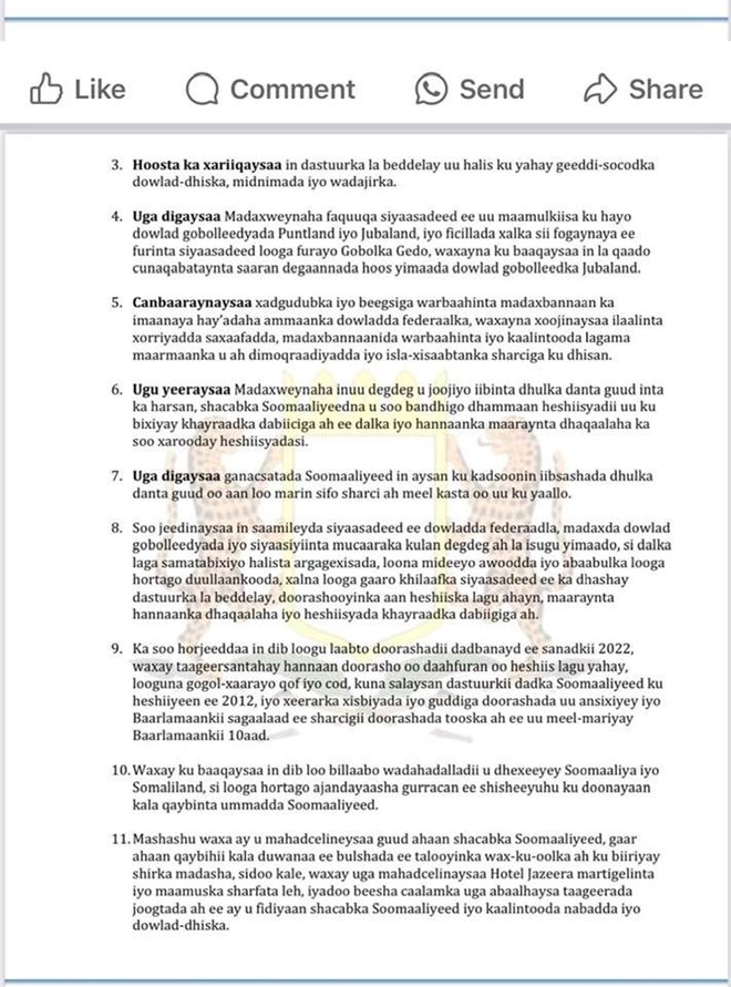 Madasha waxay madaxweynaha uga digeen, sida ay hadalka u dhigeen, faquuqa siyaasadeed ee uu ku hayo dowlad goboleedyada Puntland iyo Jubbaland, iyagoo ka digay ficillada sii hurinaya khilaafka siyaasadeed, gaar ahaan arrimaha Gobolka Gedo. Waxay sidoo kale ku baaqeen in la qaado cunaqabataynta saaran deegaanada hoos yimaada Jubbaland.