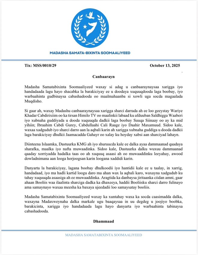 Talaado, October 14, 2025 (HOL) - Madasha Samatabixinta Soomaaliyeed ayaa si adag u cambaareysay xarigga iyo hanjabaadaha loo geystay wariyeyaasha iyo xubno ka tirsan guddiga u dooda xuquuqda dadka laga barakiciyay suuqii Siinaay ee magaalada Muqdisho.