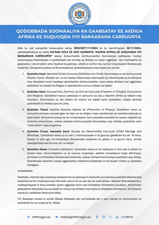 Sabti, October 4, 2025 (HOL) - Dowladda Federaalka Soomaaliya ayaa si rasmi ah u shaacisay in aysan si buuxda u oggolaanin qodobo ka mid ah "Axdi Afrika ee Xuquuqda iyo Baraaraha Carruurta", kaddib markii ay si dhow u eegtay qodobbada heshiiskaas, gaar ahaan kuwa aan la jaanqaadi karin Shareecada Islaamka iyo dhaqanka suuban ee Soomaaliyeed.