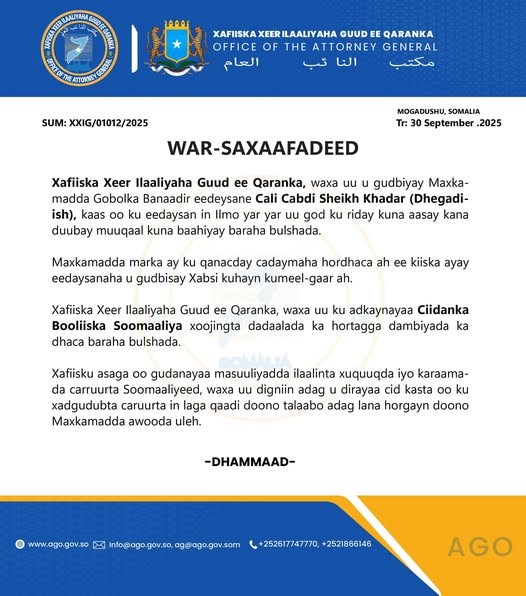 Talaado, September 30, 2025 (HOL) - Xafiiska Xeer Ilaaliyaha Guud ee Qaranka ayaa maanta Maxkamada gobolka Banaadir u gudbiyay dacwada eedeysane Cali Cabdi Sheekh Khadar oo loo yaqaano Dhegadiish, kaasoo lagu eedeeyay inuu ilmo yar ku riday god, kuna aasay, islamarkaana ka duubay muuqaal uu ku baahiyay baraha bulshada.