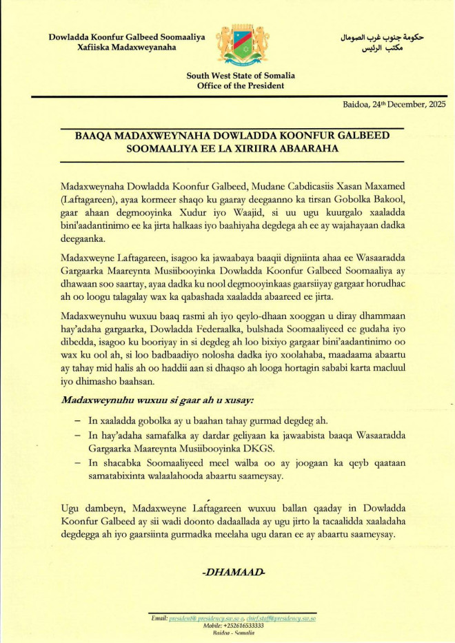 Arbaco, December 24, 2025 (HOL) - Madaxweynaha Dowlad Goboleedka Koonfur Galbeed Soomaaliya, Cabdicasiis Xasan Maxamed (Laftagareen), ayaa soo saaray baaq madaxweyne oo ku aaddan xaaladda abaareed ee ka jirta deegaanno ka mid ah Koonfur Galbeed, taas oo saameyn ba’an ku yeelatay nolosha shacabka, gaar ahaan reer guuraaga iyo beeraleyda.