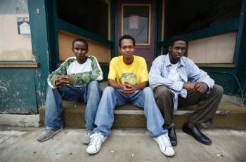 Somali immigrants Abdinasir Abib, Aydurus Farah and Abdiaiz Hassan, from left, sit on the front stoop of a downtown shop, Sunday, July 27, 2008, in Postville, Iowa