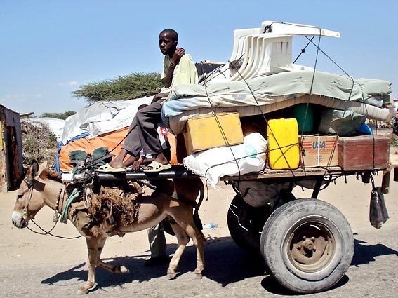 A Somali man rides a donkey cart with some of his belongings as he arrives at a camp for displaced people on the outskirts of conflict-torn |