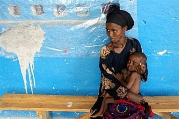 A Somali woman and her malnourished baby wait to be admitted at a therapeutic feeding centre in Wajid |