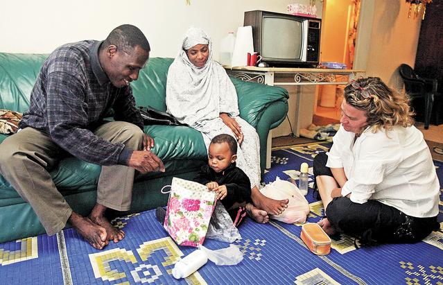 Abdullahi Iman, a Somali Bantu political refugee, sits with his daughter Dina Mohamed, 9 months; his wife, Ramla Ali, and with advocate Barbara Eiswerth in the family's apartment Monday.