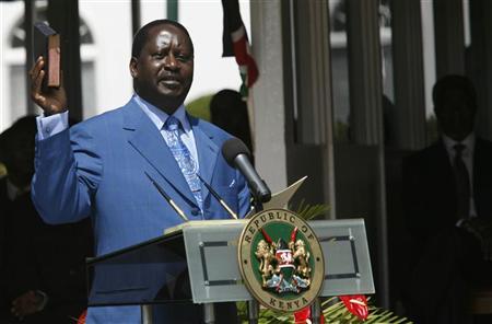 Kenya's Prime Minister Raila Odinga holds the Bible as he is sworn in during a ceremony for a 41-member power-sharing cabinet at the State House in Nairobi April 17, 2008.