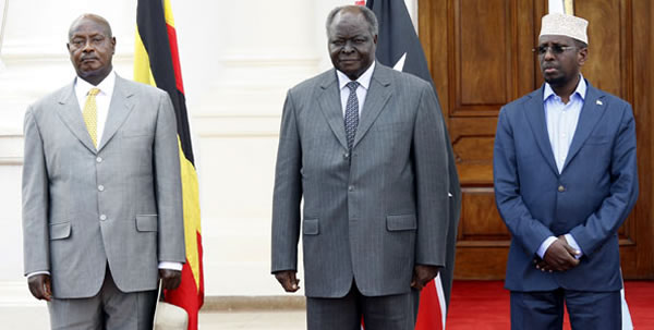 Yoweri Museveni of Uganda, President Kibaki of Kenya, Sharif Sheikh Ahmed of Somalia