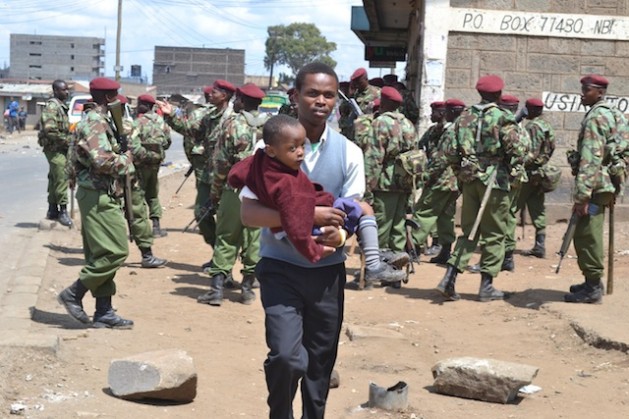 A man walks past the general service unit with his kid during the inter-ethnic riots in Kenya's Eastleigh suburb. Credit: Brian Ngugi/IPS