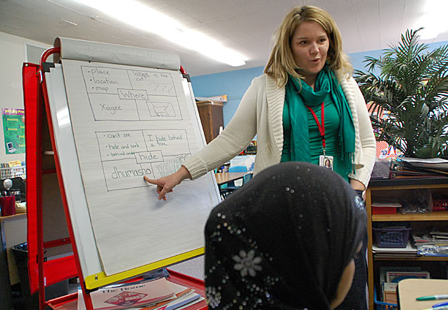 Shanda Groen is an ESL teacher at Willmar's Kennedy Elementary School. In her newcomer class, Groen teaches the basics of reading and writing to students with limited English. (MPR Photo/Tim Post)