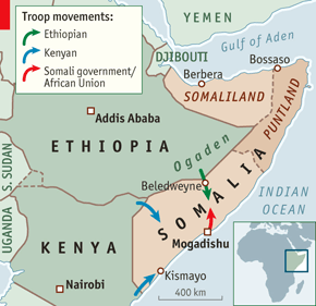 Many independent Somalia-watchers think this could once again end in tears. Somalis and Ethiopians have been fighting each other on and off for centuries, with Somali zealots, inspired by Islam, periodically launching raids on predominantly Christian Ethiopia—or so the Ethiopians have long complained. Many Somalis resent Ethiopia’s sovereignty over the ethnic-Somali region of Ogaden. An attack on it in 1977 by Somalia ended disastrously; an Ethiopian counter-offensive backed by Cuban troops wrecked Somalia’s army and led to the collapse in 1991 of the last Somali regime to control the whole country. It was 15 years later that Ethiopia invaded Somalia with American support to unseat an Islamist government in Mogadishu, the seaside capital that has long been a wreck.
